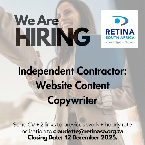 Retina South Africa is committed to diversity and inclusion. Preference will be given to suitably qualified candidates who are persons with disabilities.